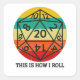 Cool borad game geek design wih a d20 dice showing the result of a 20 and the caption "This is how I roll" on aretro style sunset background.