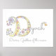 Pretty D initial / monogram art name poster perfect for a girls bedroom or playroom in shades of grey, white, yellow, pink and purple. Personalize with your child's own name beginning with D, and name meaning for a truly personalized touch to your child's bedroom or nursery, this example is for the name D Dyvah Divine, Goddess of the moon. Cute poster print ideal for a new baby, christening or baby shower gift. © Unique initial letter D hearts and flowers drawing description and graphic art design by Sarah Trett. www.sarahtrett.com for www.mylittleeden.com