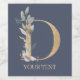 Letter D monogram floral. Letter D in golden brown texture accented with green watercolor compound leaves, flower blossoms and gold dust droplets. Personalised with name in matching font.