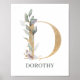 Letter D monogram floral. Letter D in golden brown texture accented with green watercolor compound leaves, flower blossoms and gold dust. Personalized with name in matching font.