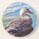 A photograph of a female Mallard duck standing in the shallow area of a pond, with water ripples moving away from her in a circular motion.