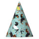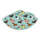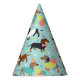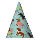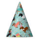 Cute birthday party dachshund dogs with black, tan and dapple coats dressed in cute birthday outfits with balloons, cake and confetti pattern.