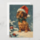 Share the holiday cheer with a charming Christmas card featuring an adorable Dachshund donning a festive Santa hat. The playful pup's joyful expression and the whimsical touch of the hat bring warmth and merriment to the card. Perfect for spreading smiles and seasonal greetings, this card captures the spirit of the holidays with its endearing canine charm. Send wishes for a tail-wagging, festive season with this heartwarming and delightful Christmas card.