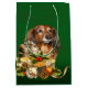 Long haired and slightly elderly red dachshund proudly sits by her Christmas gifts dog lovers Christmas holiday gift bag