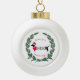 Fun and festive Ceramic Ball Christmas Ornament with cute graphic dachshund in Santa hat and quirky text, all framed in a circular wreath of holly. A light-hearted Christmas decoration for pet lovers to add to the tree.