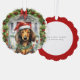 A Christmas Holiday Ornament Card with Dachshund sausage dog in a Santa hat and holiday lights, stood in front of a Christmas decorated front door. brown and tan wiener dog Holiday decoration cards, a unique wonderful alternative to a traditional card from Ricaso - add your own text