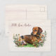 Dachshund dog lover postcard with custom text on the front. Send a note that begins with, "Hello from .. name" in brown script. Continue your message on the back with your own handwriting. Light brown wood boards background, with a sweet brown dachshund pup lying among the wildflowers.