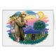 The patron saint of animals and a loved figures that crosses denominational lines, St. Francis is shown here with a long haired black and tan Dachshund . The figure of Saint Francis itself was adapted from Giotto's 14th century masterpiece and a new background was created by Jean Fitzgerald