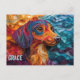 This is an abstract colourful dog portrait of a Dachshund breed dog in paper quilling art style. It is a lovely postcard for dog lovers and Dachshund owners.