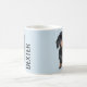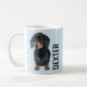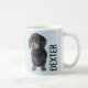 Personalised pet mug featuring a light blue background that can be changed to any colour, a cute dachshund doggy and their name. A perfect gift for any dog lover!