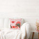 A fun and pretty Valentine's Day pillow features a white and pink gingham background with a cute Dachshund dog wearing a coral dotted coat and chevron stripe winter hat, a heart balloon with a red heart and bone, and a winged heart that you can easily customise with a name!