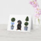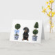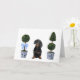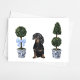 These greeting cards feature a watercolor portrait of a dachshund sitting in between two chinoiserie style topiaries.