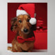 Dachshund Sitting In Front Of A Christmas Gift Poster