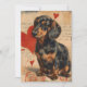 Capture the essence of nostalgia with this vintage postcard featuring a charming Dachshund surrounded by delicate roses and hearts. The sepia-toned image exudes timeless warmth, evoking a sense of love and companionship. The Dachshund's playful and distinctive demeanour is beautifully complemented by the soft floral backdrop, making it a heartwarming keepsake for dog lovers and vintage enthusiasts alike.