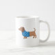 Adorable cartoon illustration of a wiener dog (dachshund) in a sweater. On one side of the mug the sweater is red, on the other blue.