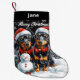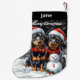Add a delightful touch to your holiday decor with this charming Christmas stocking featuring two adorable Dachshunds dressed in Santa hats and red bow ties. The design captures the playful Dachshunds sitting in a snowy winter scene alongside a cheerful snowman, with snowflakes gently falling in the background. The Christmas stocking includes the festive message "Merry Christmas," making them perfect for spreading holiday cheer. Ideal for dog lovers and Dachshund enthusiasts, this Christmas stocking will bring warmth and joy to your mantle and holiday celebrations! generativecontent