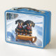 Enjoy your meals on the go with this charming Dachshund metal lunch box! Featuring two Dachshunds enjoying a sled ride in the snow. Ideal for Dachshund lovers and dog fans, this cute and practical lunch box makes a thoughtful gift while adding a touch of Dachshund charm to lunchtime.