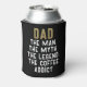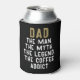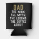 Dad Man Myth Legend Coffee Addict Funny Father's Day Can Cooler. Funny Father's day can cooler with humourous quote ' Dad, the Man, the Myth, the Legend, the Coffee Addict '. The text is in modern bold typography. You can change any text.