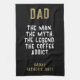 Dad Man Myth Legend Coffee Addict Funny Father's Day Kitchen Towel. Funny Father's day kitchen towel with humourous quote ' Dad, the Man, the Myth, the Legend, the Coffee Addict '. The text is in modern bold typography. You can change any text on the towel.