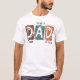 This white t-shirt features the word "DAD" in large, stylised block letters with a distressed texture and varying shades of brown, teal, and orange. Above "DAD" is the text "THE MYTH," and below are "THE MAN" on the left and "THE LEGEND" on the right, all in a smaller, simple font. The design celebrates fatherhood with a bold and legendary theme.