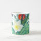A white mug decorated with red tulips and daffodils from an original Oil Pastel painting by Judy Adamson.