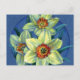 Enjoy spring anytime with this floral daffodils fine art postcard. Postcard created from original painting ‘Daffodils – the joys of spring’ by Sarah Trett. Reproduced from original watercolour and gouache painting on blue card by Sarah Trett.
