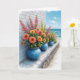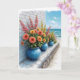 Brightly coloured dahlia flowers are arranged in blue ceramic pots on a brick ledge beside a sandy beach for thinking of you.