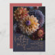 Birthday party invitation template with pretty dahlia flowers. Modern fonts and colours of dark blue-purple with peach blush, make a unique and memorable design for a milestone celebration. Handwritten "birthday party" text is next to printed party info which aligns right. A bouquet of gorgeous dahlias decorates the top portion of the cards. Reverse is dusty rose colour. This invitation also comes as an instant download.