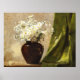 Still life painting by Paul Gustave Fischer (Danish) showing a beautiful bouquet of daisies in a brown enamel vase against a light background with an olive green curtain.