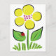 A stylised daisy in full bloom, rises above a few blades of grass. A red ladybug sits on one of the flower's leaves.