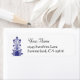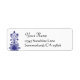 A custom return address label with script and standard letters and a vintage printers mark with a decorated shield and a a floral design of daisies and curling leaves in blue, restored from an antique manuscript