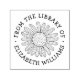 From the library of or this book belongs to rubber stamp with a drawing of a daisy in the center and your custom text and name in a whimsical serif font.