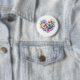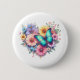 Button with a beautiful illustration. A heart-shaped bouquet of flowers in pastel blue, green, purple and yellow. With a lovely blue butterfly hovering in front.