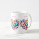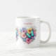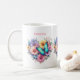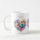 A mug with a beautiful illustration. A heart-shaped bouquet of flowers in pastel blue, green, purple and yellow. With a lovely blue butterfly hovering in front.