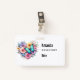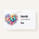 Name tag with a beautiful illustration. A heart-shaped bouquet of flowers in pastel blue, green, purple and yellow. With a lovely blue butterfly hovering in front.