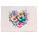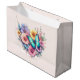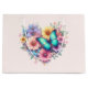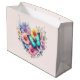 Gift bag with a beautiful illustration. A heart-shaped bouquet of flowers in pastel blue, green, purple and yellow. With a lovely blue butterfly hovering in front.