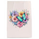 Gift bag with a beautiful illustration. A heart-shaped bouquet of flowers in pastel blue, green, purple and yellow. With a lovely blue butterfly hovering in front.