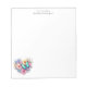 A notepad with a beautiful illustration. A heart-shaped bouquet of flowers in pastel blue, green, purple and yellow. With a lovely blue butterfly hovering in front.