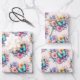 Wrapping paper sheets with a beautiful illustration. A heart-shaped bouquet of flowers in pastel blue, green, purple and yellow. With a lovely blue butterfly hovering in front.
