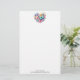 Stationery paper with a beautiful illustration. A heart-shaped bouquet of flowers in pastel blue, green, purple and yellow. With a lovely blue butterfly hovering in front.