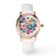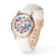 A watch with a beautiful illustration. A heart-shaped bouquet of flowers in pastel blue, green, purple and yellow. With a lovely blue butterfly hovering in front.
