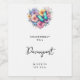 Personalized wine making bottle labels with a beautiful illustration. A heart-shaped bouquet of flowers in pastel blue, green, purple and yellow. With a lovely blue butterfly hovering in front.