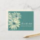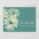 Stunning fine art painting osteopermum calenduleae wedding save the date invitation. Simple and romantic wedding save the date invite, in green and ivory shades with a touch of purple. Classic wedding design part of the daisy romantic wedding stationary set. Edit this save the date wedding postcard with your names, dates and own wording. Uniquely painted in gouache on dark paper by artist and designer Sarah Trett.