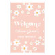 Retro inspired daisy pink baby shower welcome sign with 70's style daisies and boho fonts and colours.
