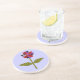 This pretty sandstone coaster features a digital image of a daisy with a green stem with two green leaves on it and purple, red and black coloured petals with a purple centre. The petals look like they are made of shining plastic that has caught the light and caused an iridescent effect. The background is a calming blue colour.