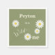 Our Wild One paper napkins are the perfect choice for your little one's first birthday party. Typography on the napkin reads: CHILD'S NAME is a Wild One. Wild is in script. The O in one is a daisy, one of the world's happiest flowers. Design includes four daisies including the daisy in the word one. These napkins are a great match to our other Wild One party essentials. This design is in green and white. Other colours available.