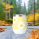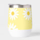 Colourful yellow and white wine tumbler featuring an all over daisy design. Dark grey typography can be personalised with a name. This cute tumbler is perfect for a bridesmaid gift. Also great for a girls trip or monthly book club meetings. Coordinating daisy items available in my store.