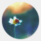 A playful red ladybug on a delicate yellow centred white daisy flower. The artistic style gives this floral nature image a whimsical feel.