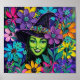 Vibrant witch painterly, smiling green-faced sorceress in a jeweled black hat surrounded by lush, multicolored flowers and whimsical botanical details.