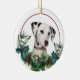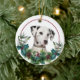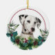 On the front of this Holiday ornament is an image of a Dalmatian Dog peeking out of a holly and evergreen bough. Red berries and pine cones decorate the holly and pine sprigs. The image is placed on a white circle within a thin red line circle. The back of the ornament has the same evergreen bough wreath and circle with your custom text in red.